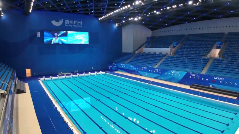 除了场馆,赛事运行也做到了“精打细算”。这里是杭州奥体中心游泳馆,馆内蓄水量超过一万吨,看似“用水大户”,实则“节水标杆”,全年不换水都能保持清澈干净,秘密就是这套24小时水循环系统。