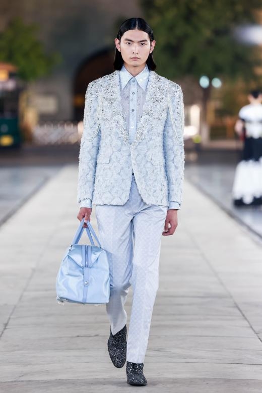 秀场上,以斑驳厚重的前门灰色城墙为底,劳伦斯·许的经典中式图案呈现凹凸有致的弧形,诠释复古与现代的相互碰撞;栩栩如生的历史建筑光影,与璀璨的北京夜色交相辉映,以沉浸式的体验,带领观众一览古都风情;华美灵动的服饰引爆全场,SS2024北京时装周就此再度振翅启航,舒展壮美的时尚飞翼。此次开幕大秀分为古都记事、都市素描、情系中轴三大系列,每个部分都展现了中轴线的独特魅力,劳伦斯·许将中式意蕴的表达结合西方文化的精神气质,荟集中华文化之大美,孕育出一个融汇过去与现在、传统与时尚、历史与未来的新型审美范式。