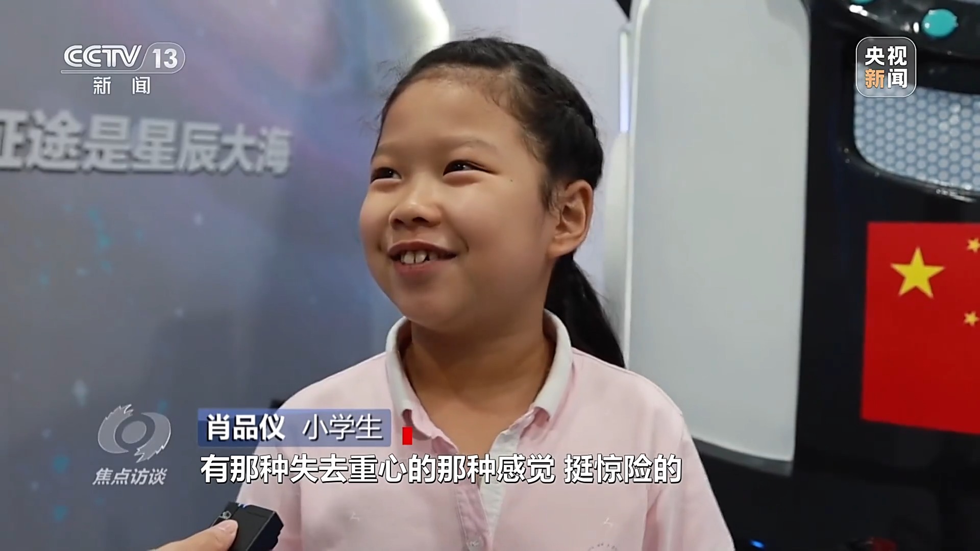 小学生肖品仪:我们坐上舱下去有失去重心的感觉,挺惊险的,航天员勇敢上去,又安安全全返回来,确实挺勇敢的。