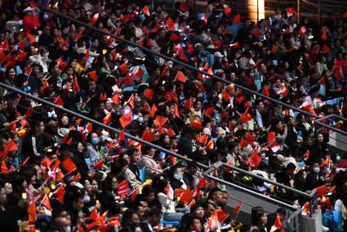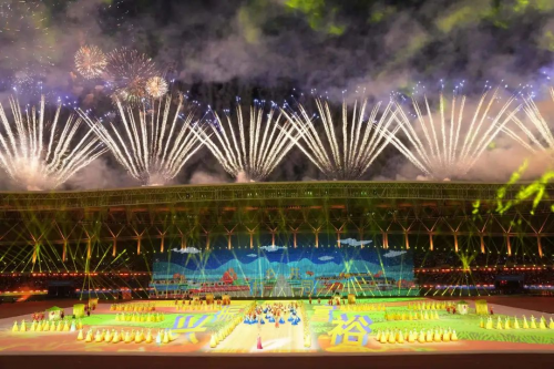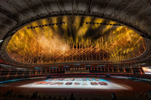 绚丽绽放的烟花和着乌兰图雅动人的歌声,幻化为漫天流星,让体育场上空流光溢彩、美轮美奂,也将开幕式气氛推向高潮,整个会场一片沸腾,掌声和欢呼声像一阵阵热浪,经久不息。