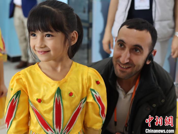 近日,外国媒体人在喀什地区疏附县吾库萨克镇七村学校与当地学生交流。 中新社记者 薄雯雯 摄