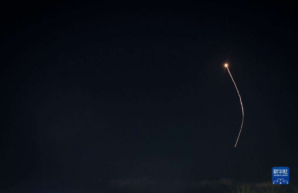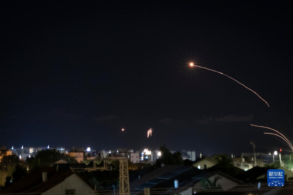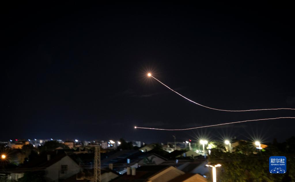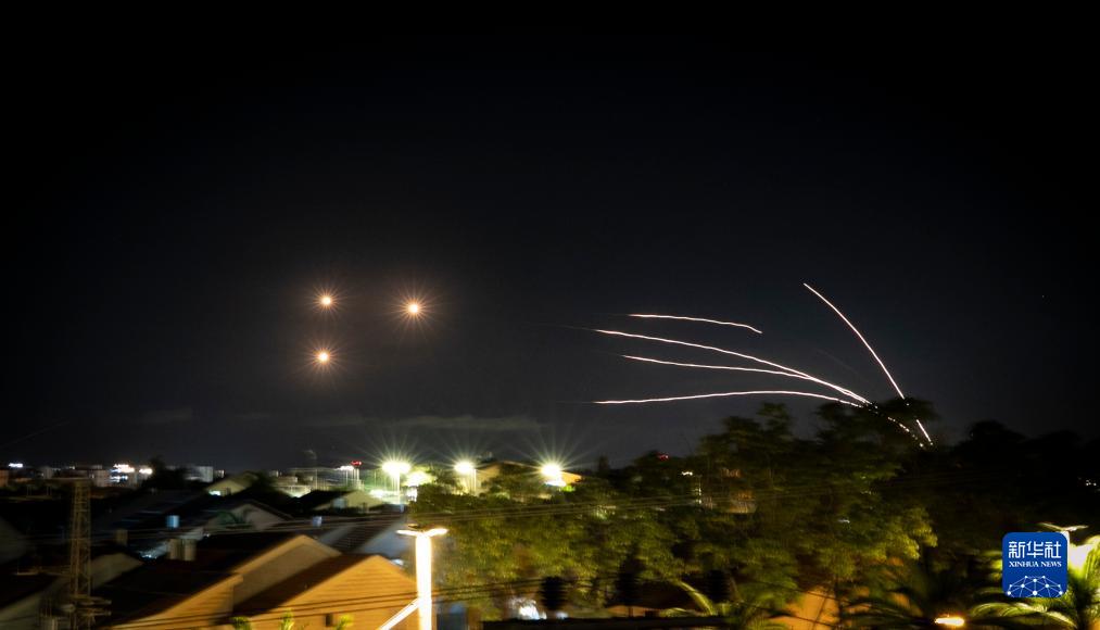 当晚,来自加沙的火箭弹不断射向以色列南部边境城市。以色列“铁穹”防御系统划破夜空进行拦截。