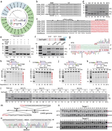 彭楠研究团队通过纯化其中一个典型的TnpB(命名为SisTnpB1)及其结合的引导RNA核糖核蛋白复合物进行体外核酸切割实验,发现SisTnpB1在较广的温度活性范围内(37~85℃)均具有活性,其中最适温度在65~75℃之间。