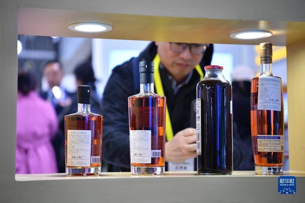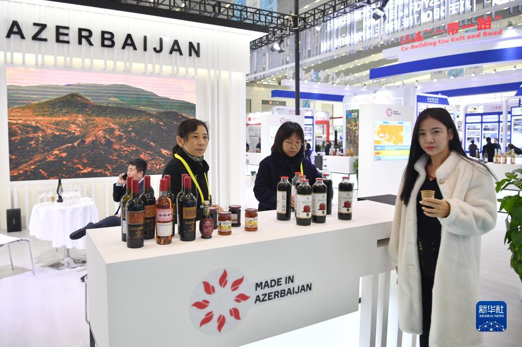 11月16日,观众在第七届丝博会上参观阿塞拜疆展位上的酒水产品。新华社记者 邵瑞 摄