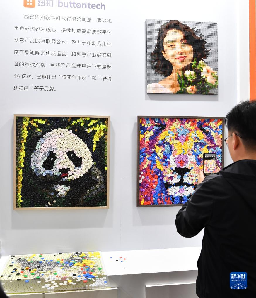11月16日,观众在第七届丝博会上参观由纽扣制作的文创产品。新华社记者 邵瑞 摄