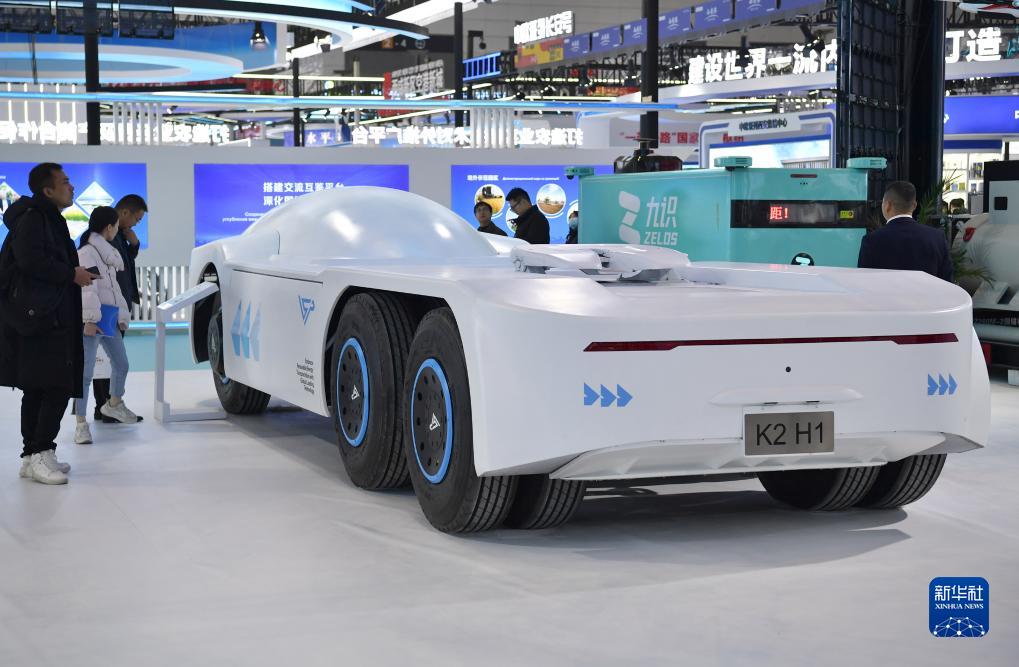 11月16日,观众在第七届丝博会上参观一款电动重卡滑板底盘。新华社记者 邵瑞 摄