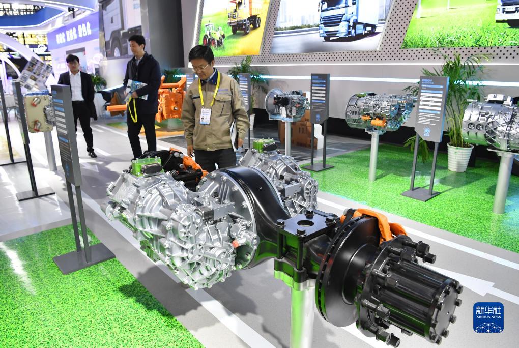 11月16日,观众在第七届丝博会上参观一款电驱桥总成。新华社记者 邵瑞 摄