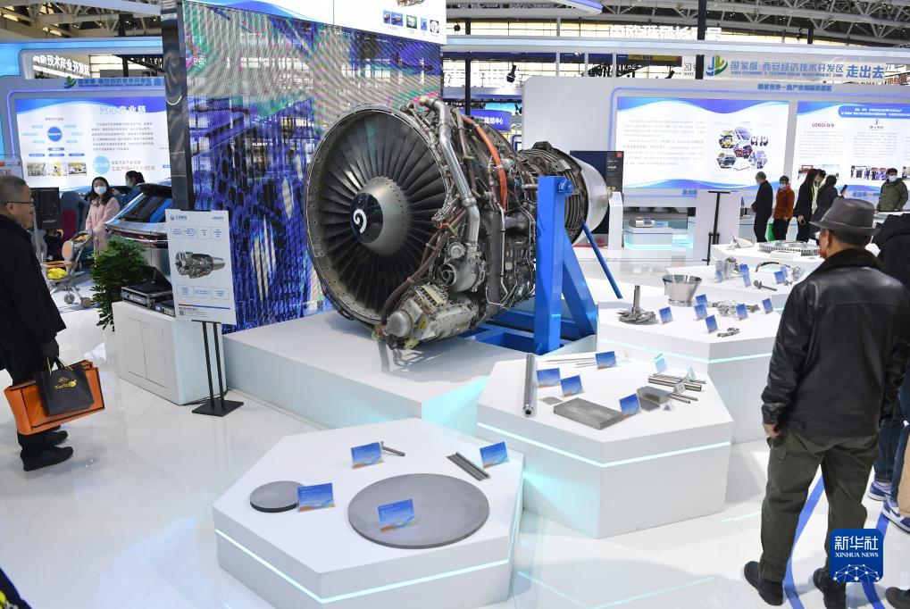 11月16日,观众在第七届丝博会上参观一款航空发动机。 新华社记者 邵瑞 摄