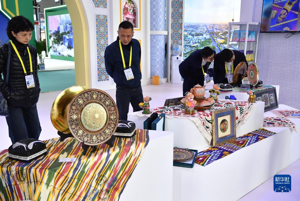 11月16日,观众在第七届丝博会乌兹别克斯坦展位上参观工艺品。新华社记者 邵瑞 摄