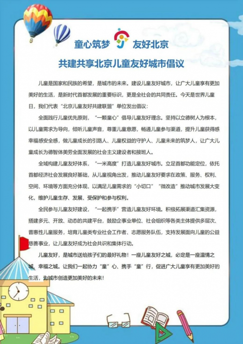 主题活动中,北京市妇女儿童服务中心、北京广播集团、北京女建筑师协会代表联盟单位发出《童心筑梦 友好北京 共建共享北京儿童友好城市》的倡议:全面践行儿童优先原则,“一颗童心”倡导儿童友好理念;全域构建儿童友好体系,“一米高度”打造儿童友好城市;全民参与儿童友好建设,“一起携手”营造儿童友好环境,让儿童友好成为社会共识和集体行动,促进广大儿童享有更加美好的生活,为城市创造更加美好的未来。