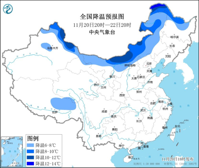 受寒潮影响,11月20日夜间至24日,我国长江中下游及以北地区气温将先后下降6~10℃,其中,内蒙古、东北地区、华北西部和北部、黄淮东部等地降温12~16℃,内蒙古中东部、东北地区东部等地部分地区降温幅度可超过16℃,大风降温主要时段为22日至24日;寒潮影响后,最低气温0℃线将位于苏皖中北部至河南中南部、陕西南部、甘肃东南部等地,内蒙古中东部和黑龙江大部最低气温将降至-20℃以下,局地可达-30℃以下;同时,上述大部地区伴有4~6级偏北风,阵风7~8级,局地9级;23日至25日,我国东部和南部海区也将先后出现6~8级大风,阵风9~10级。