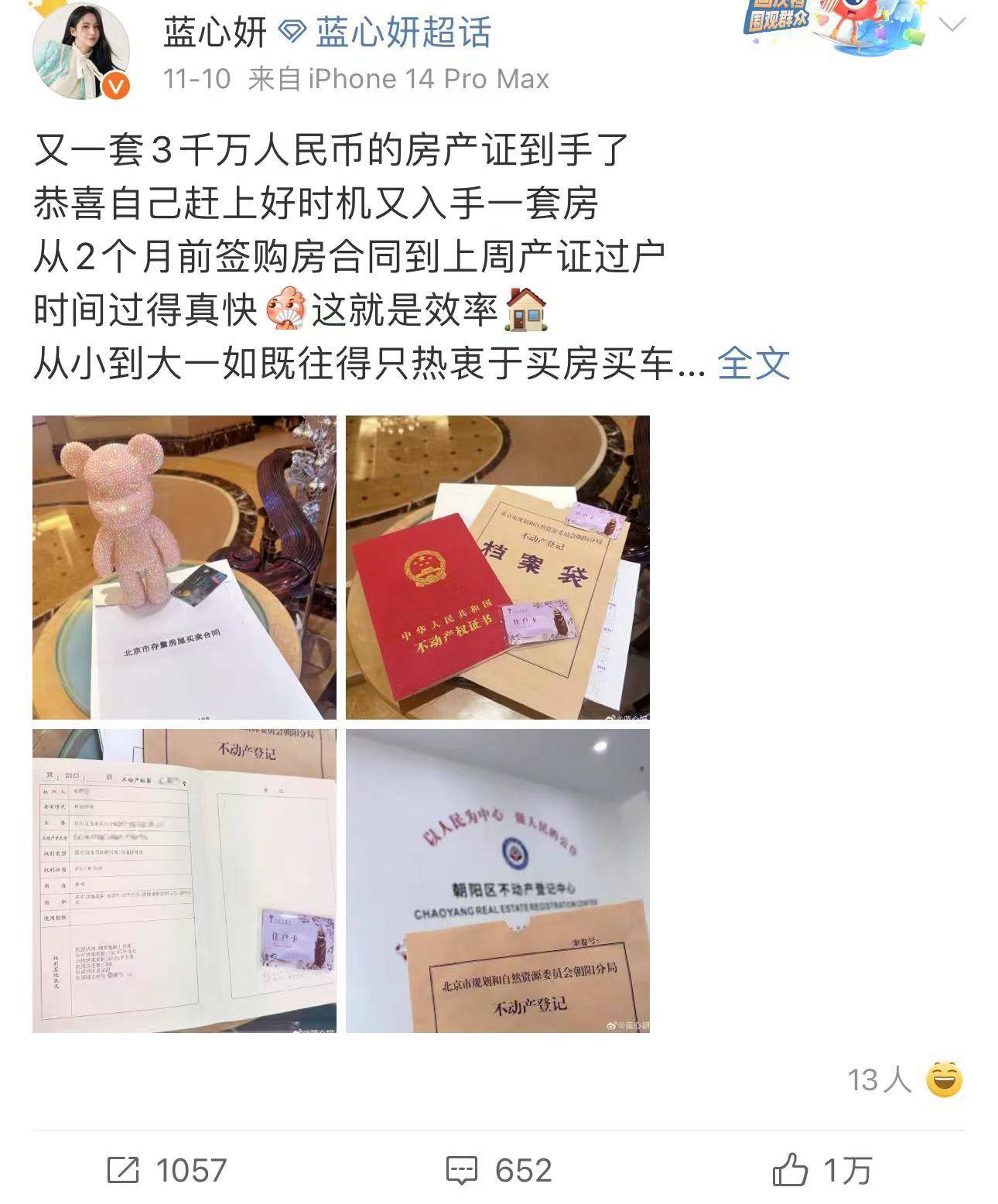 近日,香港著名影星蓝心妍(蓝燕)在网上分享最新投资房产动态,公布了自己最近又在北京投资了一套3千万元的豪宅和房产证。而该楼盘正是她此前一直住的小区,这个小区一直都是北京最早的老牌豪宅,也是精装修豪宅里的劳斯莱斯。同小区邻居有博纳董事长于冬和金巧巧夫人、汪小菲、范爷等。而这已经是她投资的第N套房产了,这投资效率,让一众粉丝们感到折服。