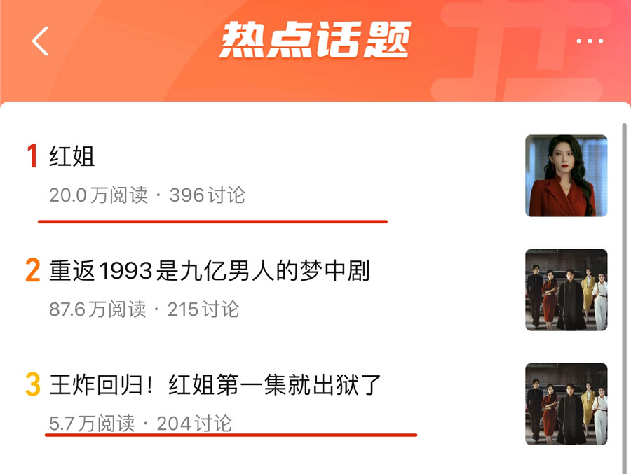 在第二季中 红姐第一集的开场 就又让观众开始热血沸腾 很多网友粉丝表示 红姐强势回归 不仅代表了重回系列的再次开启 更是代表着又有好剧可追了 在腾讯视频内部 关于#红姐 的话题 则是该剧的Top 1 #王炸回归!红姐第一集就出狱了 这一话题则荣登首播日 腾讯站内热搜第一!更是成为腾讯视频电视剧热议角色Top8 这一成绩作为99年出生的新人演员张璇来说 无疑是努力与幸运加持的结果!