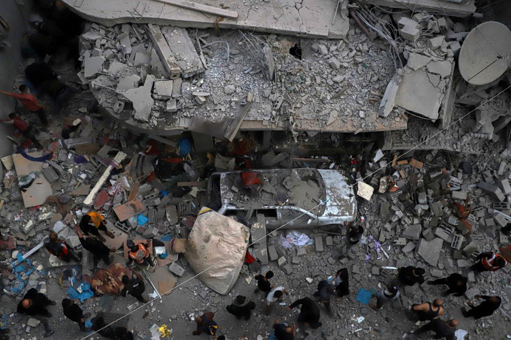 12月7日,在加沙地带南部城市汗尤尼斯,巴勒斯坦人查看遭以军袭击后的建筑废墟。新华社发(里泽克·阿卜杜勒贾瓦德摄)