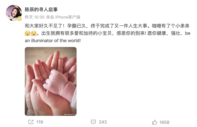 昨天东方卫视当家花旦陈辰在微博晒出了一张四手交叠的照片并配文“和大家好久不见了!孕酿已久,终于完成了又一件人生大事。咖喱有了个小弟弟。出生就拥有很多爱和加持的小宝贝,感恩你的到来! 愿你健康,强壮,be an illuminator of the world!”