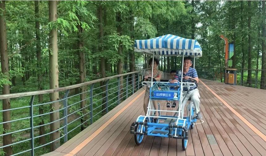 现在,绿道入口处和各个观景平台附近,一排排带顶篷哈啰共享单车整齐停放着,有双人骑行的,也有可供三到四人骑行的,只要轻松扫码,就能享受到骑行之乐。