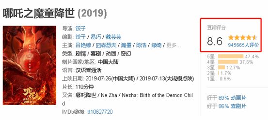 9月16日,《哪吒之转世魔童》票房正式突破49亿,逼近50亿50亿大关,成为中国影视票房排名第二的电影。不仅收获高票房,在豆瓣上,近100万人为此电影打分,评分高达8.6.