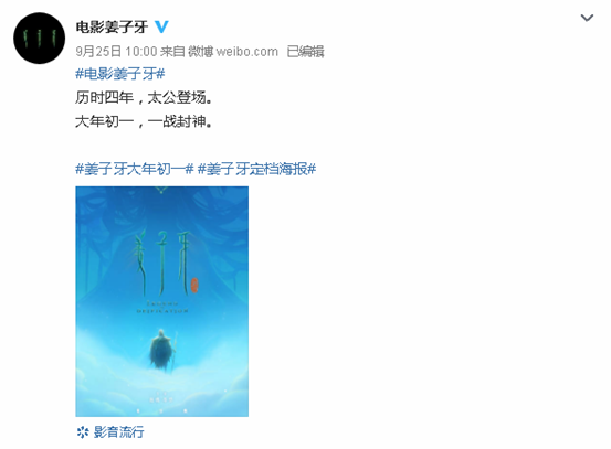 9月25日,电影姜子牙官方微博正式对外发布定档海报,推文内容中没有太多的形容,仅仅只有16字,“历时四年,太公登场。大年初一,一战封神”。气势之大,似乎有续写此前《哪吒》创造的票房传奇的意思。