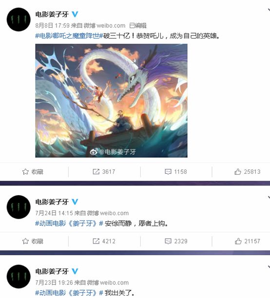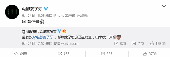 而在《哪吒》电影上映火热阶段,《姜子牙》的官微和《哪吒》电影之间的互动也非常频繁,催促太公钓鱼别太久,抓紧出关。