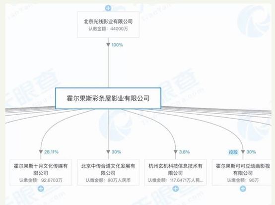 从股权穿透关系看,可可豆动画持股30%的大股东,穿透之后控股股东依然为光线传媒,同时彩条屋营业还持有十月文化28.11%的股份,为其二股东。
