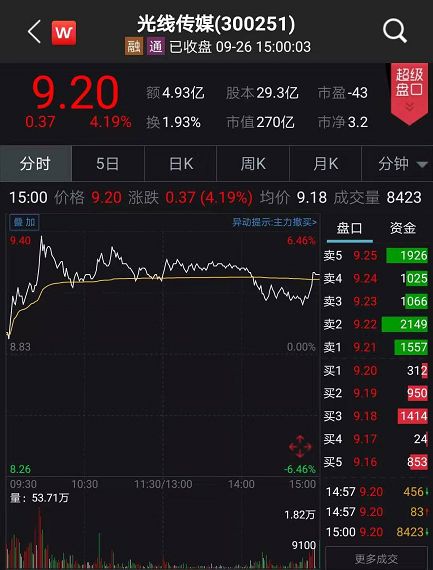 9月26日,光线传媒股价逆势飘红,盘中涨幅最高达6.46%,股价最高触及9.40元。截至当日收盘,光线传媒报收9.20元,上涨了4.19%,市值大增11亿。