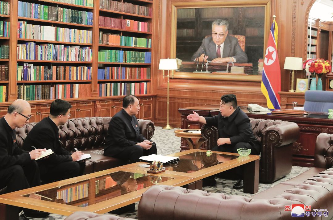 2019年1月23日,在朝鲜平壤,朝鲜最高领导人金正恩(右一)会见以朝鲜劳动党中央委员会副委员长金英哲(左三)为团长的第二次朝美高级别会谈代表团成员。图/新华