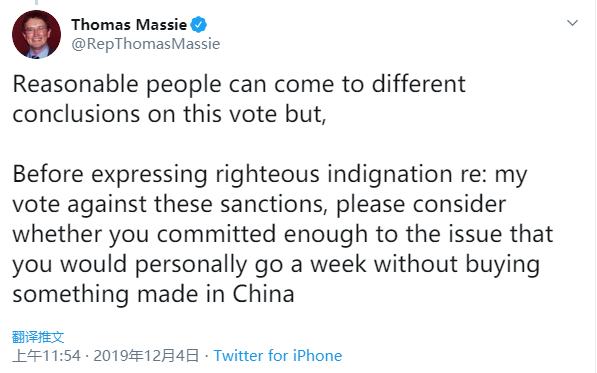 当地时间12月3日,美国国会众议院通过了蓄意诋毁中国新疆人权状况,干涉中国新疆事务的所谓“2019年维吾尔人权政策法案”,来自肯塔基州的共和党众议员马西(Thomas Massie)投下了反对票,之前,他也曾投下“香港人权与民主法案”的反对票。今天,他被英国BBC等多家外媒报道。