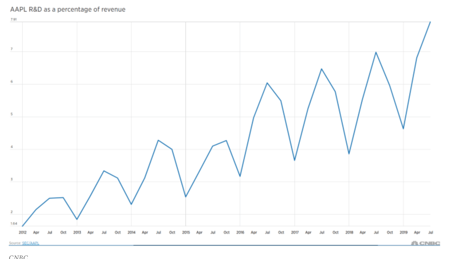 苹果研发支出占总收入的比重持续走高,图片来自CNBC