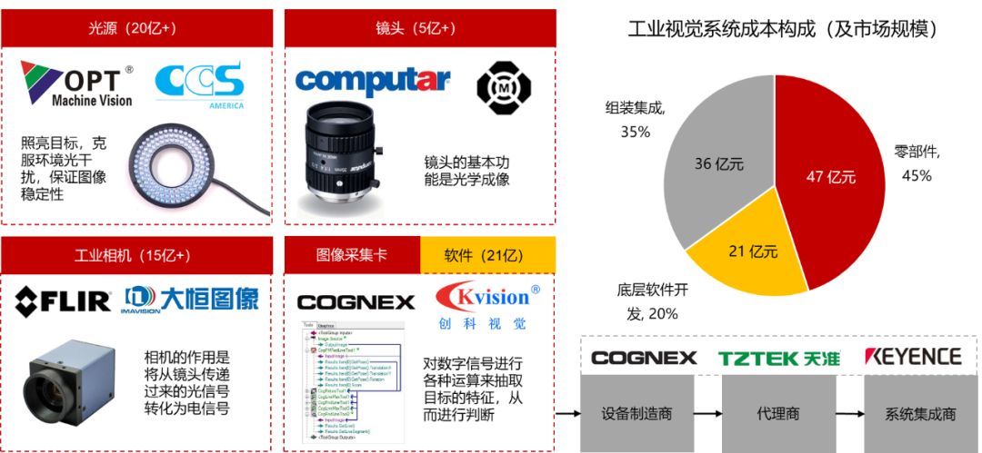 工业视觉产业链包括光源、镜头、工业相机、图像采集卡、软件、设备制造商/代理商/系统集成商等。我们认为,其中软件算法和设备集成变革机会最大,值得关注。