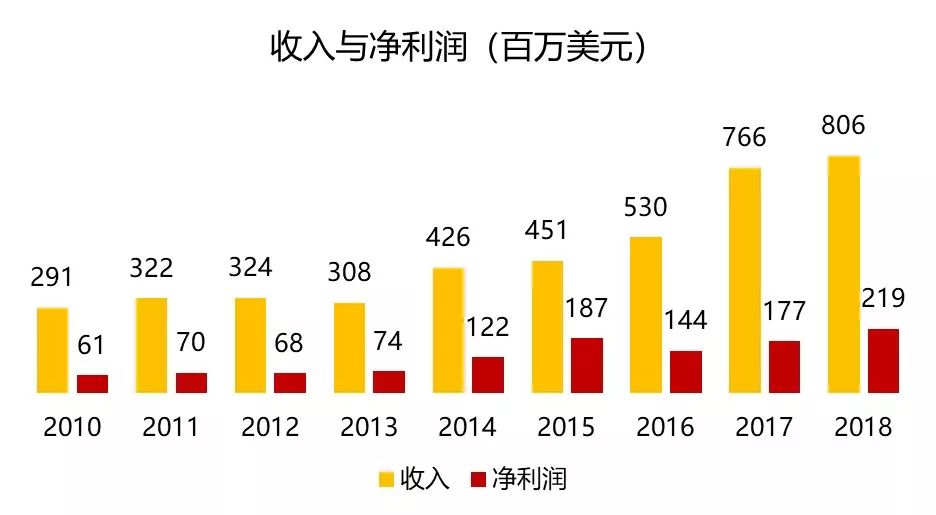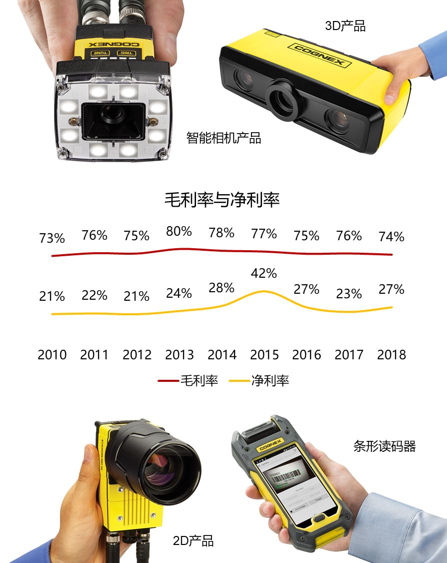 2018年,康耐视实现营收8.06亿美元,净利润2.19亿美元。2013-2018年的五年间,公司收入年化符合增长率21%,净利润复合增长率为24%。