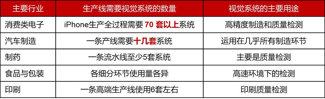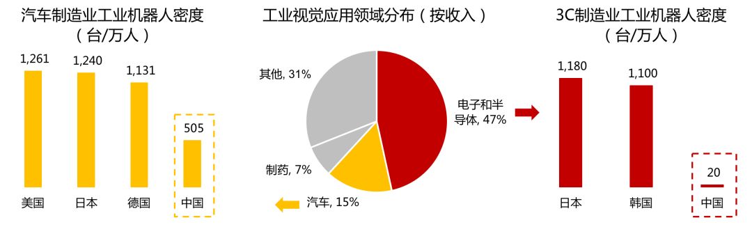 在工业视觉最大的应用行业消费电子和汽车制造中,一条生产线需要的视觉系统数量可能高达十几套。在这两个重点行业中,中国的工业机器人密度对比美国、日本、韩国、德国等发达国家仍有较大差距。