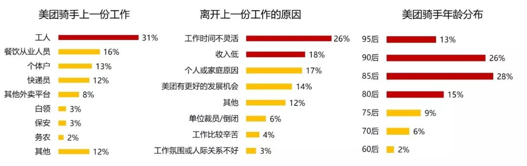 80、90后为美团骑手群体的中坚力量,占比高达82%。值得注意的是,31%的骑手的上一份工作是产业工人。而离开的原因普遍是工作时间不灵活、收入低。而外卖骑手这一岗位对他们最大的吸引力就是多劳多得(一般6-8千),其次是工作时间自由。