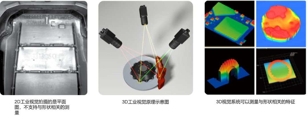 3D视觉系统通常由多台不同位置的相机组成,可以测量与形状相关的特征,使用范围更广(例如工业机器人)。