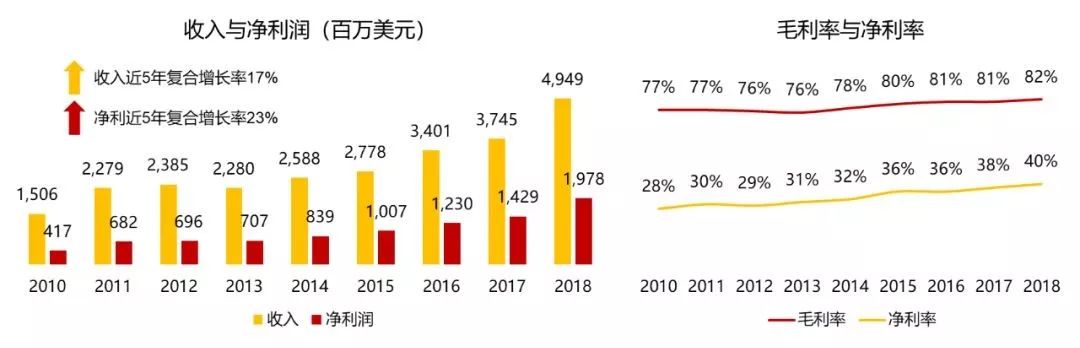 2018 年,康耐视实现营收49.5 亿美元,净利润 19.8 亿美元。2013-2018 年的五年间,公司收入年化符合增长率 17%,净利润复合增长率为 23%。