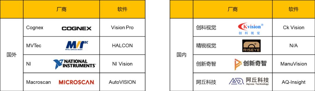 软件算法是工业视觉系统的“大脑”,决定了工业视觉的准确率和价值,是整个系统中最重要的环节,获利空间较大。过去由于盗版问题的存在,因此国内厂商自行开发较少(目前版权保护有所好转)。国外MVTech开发的Halcon和Cognex开发的Vision Pro是当下最常用的视觉开发包。国内创科视觉的CK Vision相对前面几个工具包来说价格优势比较明显,在国内用量很大。