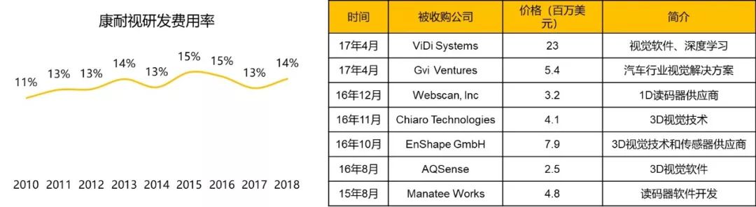 并购是康耐视不断做大并成为全球性公司的重要手段,并购主要在四个方向:(1)扩大产品线;(2)获取最先进的技术;(3)扩大客户群或进入新领域;(4)拓展经销商网络。2015-2017年,公司一共完成了7项小并购,其中就包括2300万美元收购深度学习公司VidiSystems并推出相关系列产品。公司目前仍旧处于0债务经营的状态。