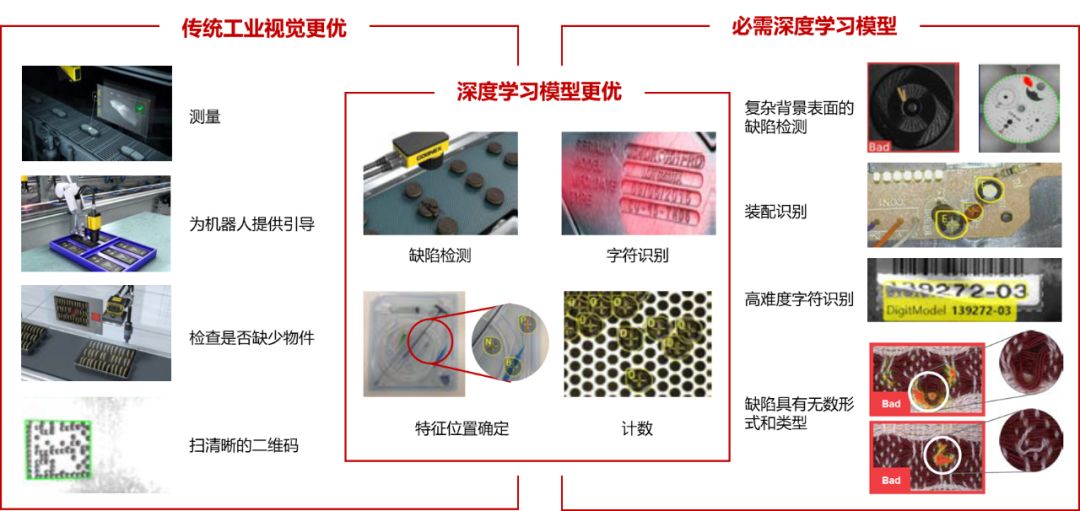 工业视觉从当前的应用场景领域拓展到新的场景时需要克服2个“关卡”:技术关和经济性关。深度学习的出现使得技术关的通过变得更加容易。一方面,深度学习可以帮助视觉系统完成更加复杂的任务。另一方面,使用深度学习模型后,工作人员无需建立复杂的数据库和软件开发。