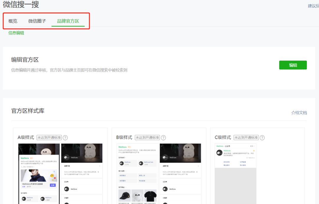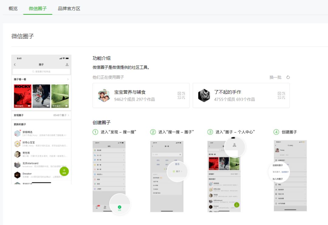 这一点,看一看「微信圈子」在公众号后台的位置就知道了。「微信圈子」左边是搜一搜概览,右边是「品牌官方区」,这两个按钮里都有实际的功能承载,在这些页面里,公众号运营者不仅能看到功能介绍,还能直接开通功能、自定义展示。