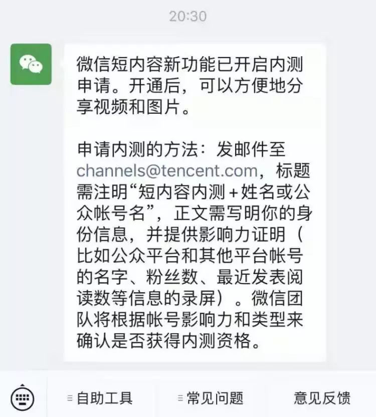 从图片来看,该功能需要运营者发邮件申请,微信团队会根据申请者的账号影响力和类型来发放内测资格,并没有透露其会是怎样的产品形态。