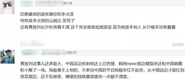 黄致列回归歌手,网友就翻出他一边讨好中国观众,一边在韩国节目中刻意夸张抹黑中国;李贞贤在社交网络发照片表示为了中国旅客特意打扮,网友也忘不了她这边来国内表演,回去就撒谎遇到山贼。