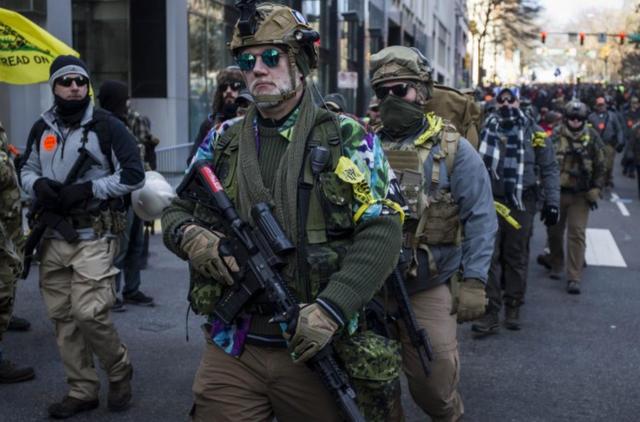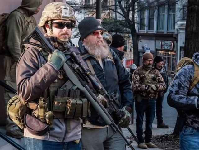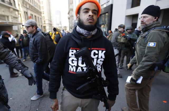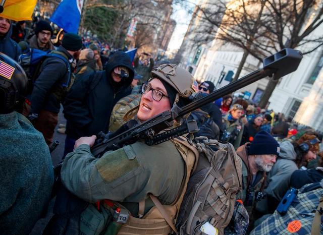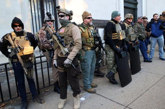 当地时间周一,成千上万名持枪权利活动人士聚集在弗吉尼亚州国会大厦周围的街道上,抗议民主党控制的州议会日前通过的枪支控制法案,人群中许多人穿着迷彩服或战术重装备,手持大型武器。