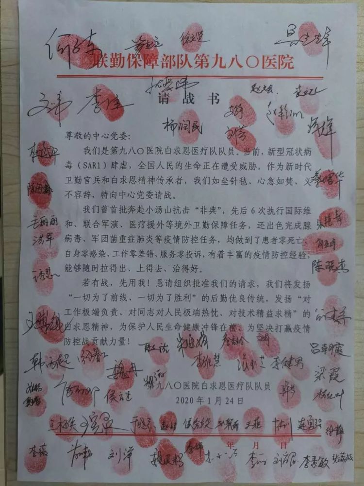 就在刚刚过去的除夕之夜,一张请战书按满红手印!从院领导到医护,从抗击非典的老队员,到维和归来的医生,从年轻的妈妈,到初婚的妻子,甚至还有已经脱下军装返聘留院的专家骨干……他们庄严宣誓:我请战!只要组织一声令下,我们必将挺身而出,绝不后退半步!