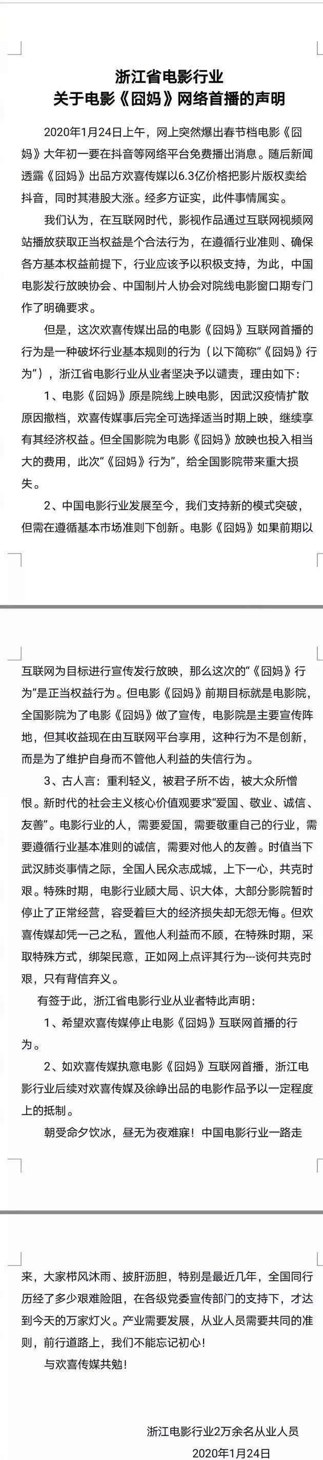 浙江电影院线的一纸声明自然是事出有因、绝非“无理取闹”,但对于观看和消费习惯正潜移默化改变的观众们来说,徐峥、《囧妈》和欢喜传媒、字节跳动都是“英雄”。