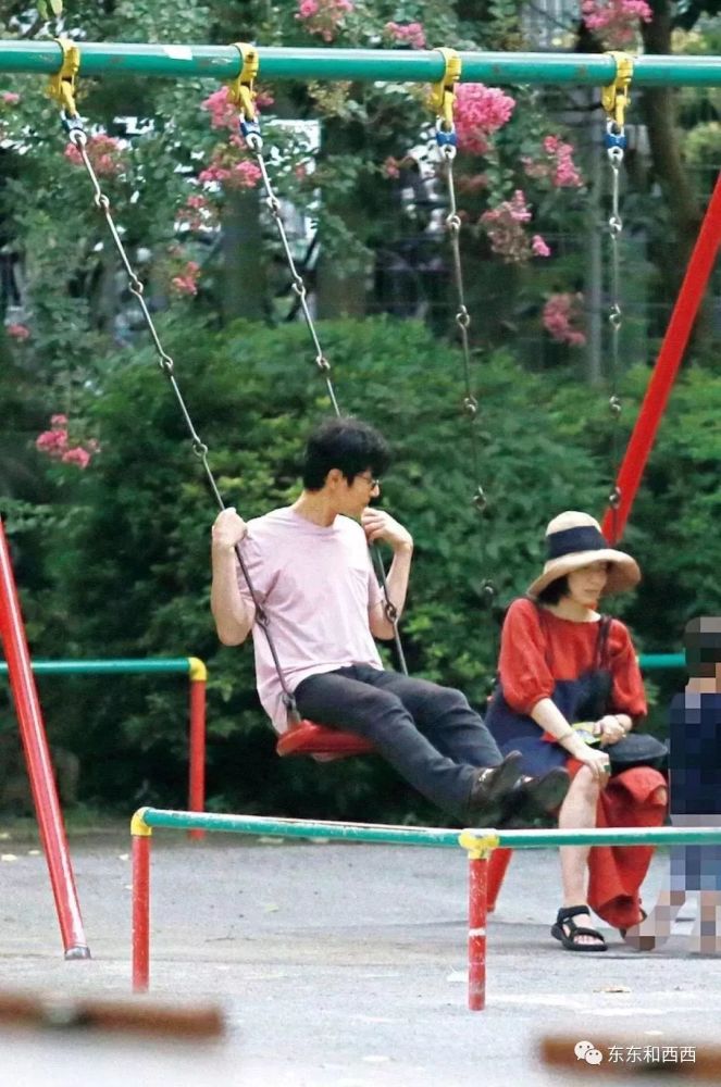 去公园荡秋千,还偷偷看老婆生怕她无聊了。