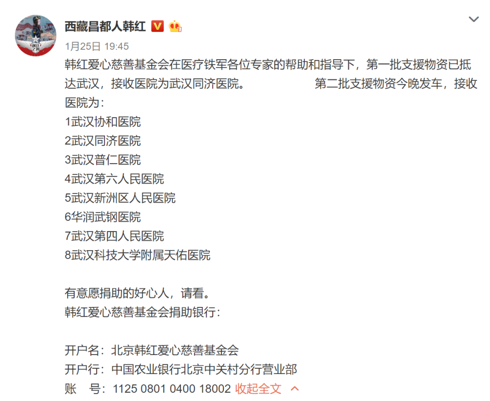 1月26日,韩红公布了更多参与捐款的艺人、好友名单,包括易烊千玺、孙俪、张靓颖、张歆艺、袁弘、王鸥、谭维维、陈赫等众多艺人参与了捐款。