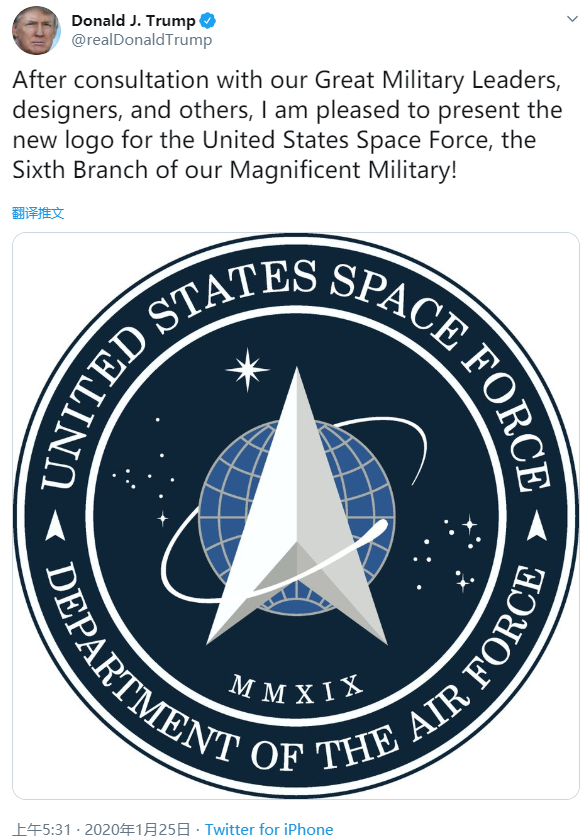 特朗普在推特上说,“在与我们伟大的军事领导人、设计师和其他人磋商之后,我很高兴地向大家介绍美国太空军的新徽标,这是我们伟大军队的第六支军种!”