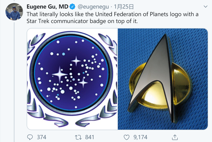 还有网友描述其中的细节感叹道,“它看起来真像(《星际迷航》中)‘星际联盟’的标志,上面还有一个‘星舰迷航’通讯员的徽章。”