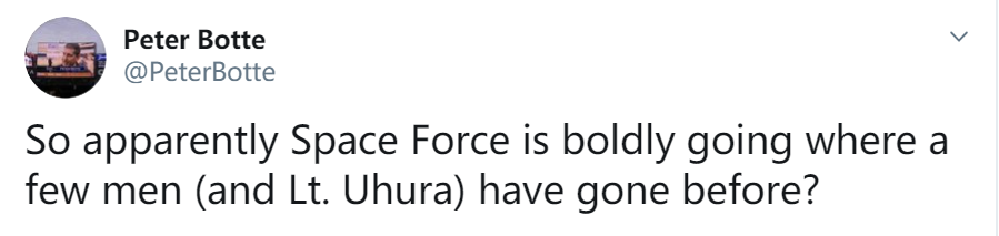 BBC称,有网友还开玩笑说,美国太空军“抄袭”了《星际迷航》的“作业”:“所以很明显,太空军正大胆地向一些人(和乌胡拉中尉(《星际迷航》中的角色))以前去过的地方前进。”
