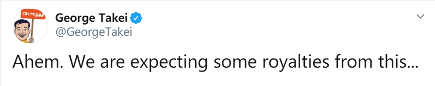 而就连曾主演过《星际迷航》的日裔美国演员乔治·武井也在推特上“巧妙”地回应道,“嗯哼。我们希望从中收取版权税……”