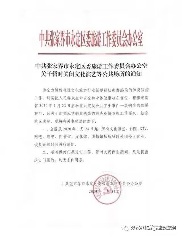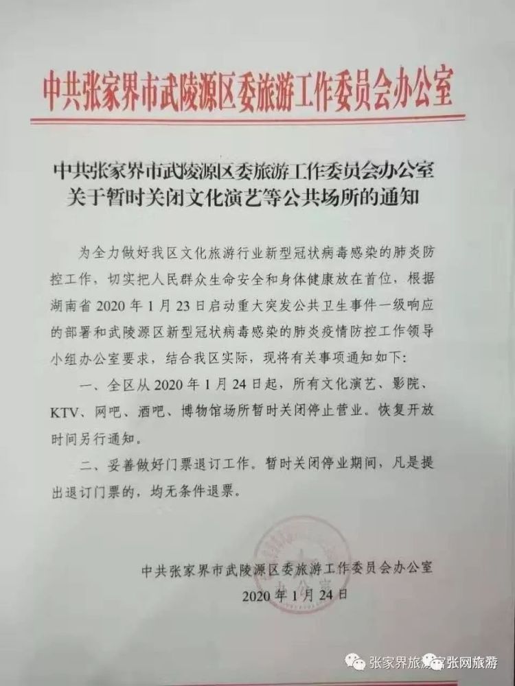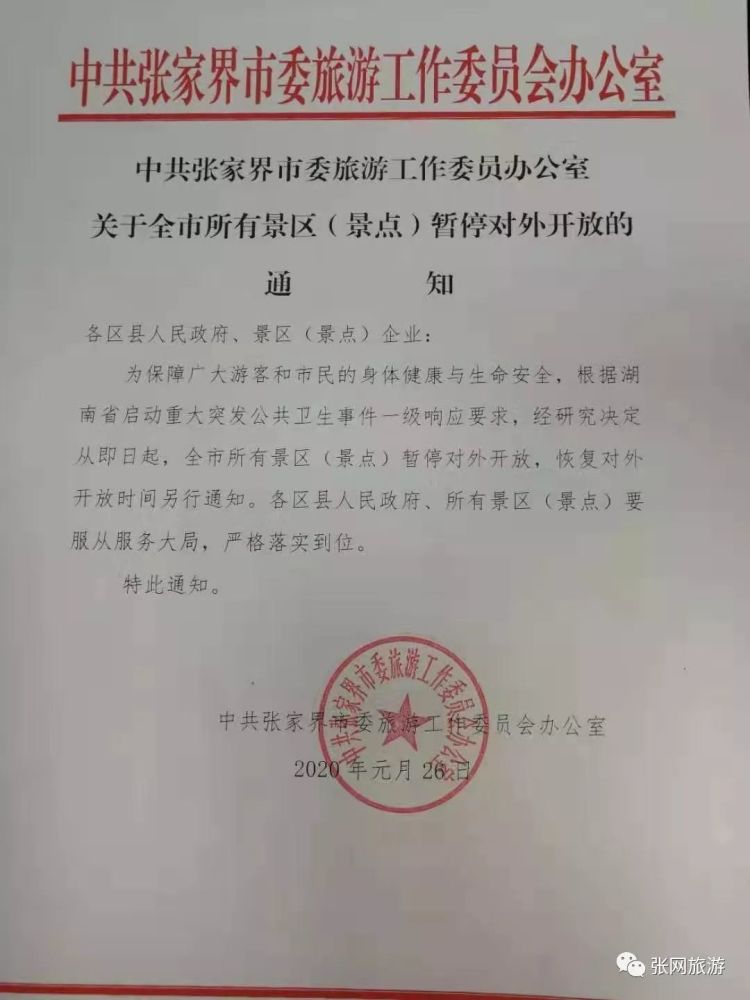为保障广大游客和市民的身体健康与生命安全,根据湖南省启动突发公共卫生事件一级响应要求,经研究决定从即日起,全市所有景区(景点)暂停对外开放,恢复对外开放时间另行通知。各区县人民政府,所有景区(景点)要服从服务大局、严格落实到位。
